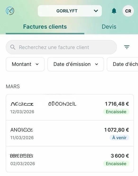 Les noms des clients sont anonymisés. Le client à 3 600€ inclut des prestations d’influence en plus de Gorilyft. Celui à 1 716,48€ correspond à un abonnement annuel Gorilyft. Les 2 autres ont signé mais n’ont pas encore réglé.